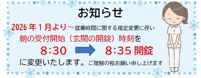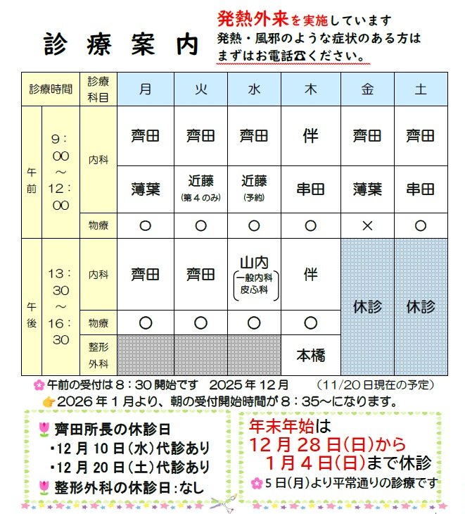| 休診日 | 12月29日~1月3日までと日曜日、祝祭日、金曜日午後・土曜日午後は休診しています。 |