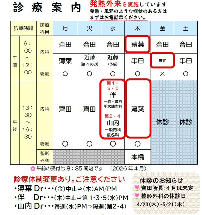 | 診療科目 | 内科、呼吸器内科、整形外科 在宅療養支援診療所 |