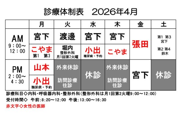 | 診療科目 | 内科、整形外科 禁煙外来、機能強化型在宅療養支援診療所 |